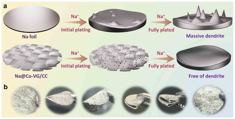 图1:Na@Co-VG/CC负极枝晶抑制原理示意图及实物照片