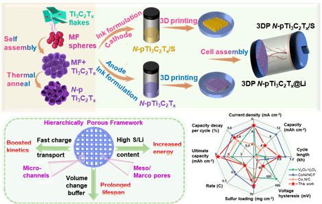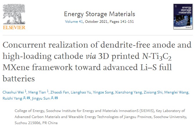近日,耽美小说 的孙靖宇教授和杨瑞枝教授合作,在Energy Storage Materials上发表题为“Concurrent Realization of Dendrite-Free Anode and High-Loading Cathode via 3D Printed N-Ti3C2 MXene Framework toward Advanced Li–S Full Batteries”的研究论文。该论文提出使用3D打印N-Ti3C2框架用于电池正负极的同时管理,实现了高负载、无枝晶的高性能锂硫电池。