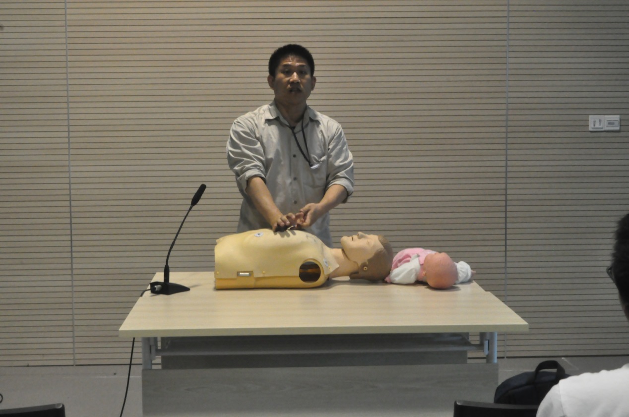 培训伊始,陈医师先用人体模型给同学们展示了心肺复苏术的示范。在风趣幽默的教学中,陈医师指出了急救过程的要点:救助之前,首先要检查周边环境是否安全,然后再开始检查患者身体状况,如果患者情况严重,需立即拨打急救电话救援或呼唤周围的人帮忙。此外,陈医师还特地指导了对孕妇和婴儿等特殊人群的急救方法和区别。接下来,陈医师又利用PPT图文并茂地给新生讲解了全自动体外除颤器等急救器械的使用,包括它的使用方法以及何种情况下使用。