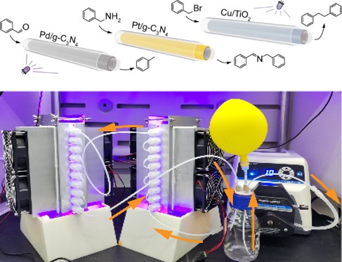 异相光催化使用半导体材料作为光催化剂,能够以太阳光或人造光源在常温、常压下实现选择性氧化还原、卤化、偶联和环加成等重要有机反应。然而,由于光穿透深度限制,规模化光催化合成难以利用传统釜式反应器实现。流动相微反应器具有最优的吸光和混合效率,且可以避免产物与催化剂的分离步骤,但其高昂的制造成本、催化堵塞风险、及复杂的操作条件仍需要进一步优化。