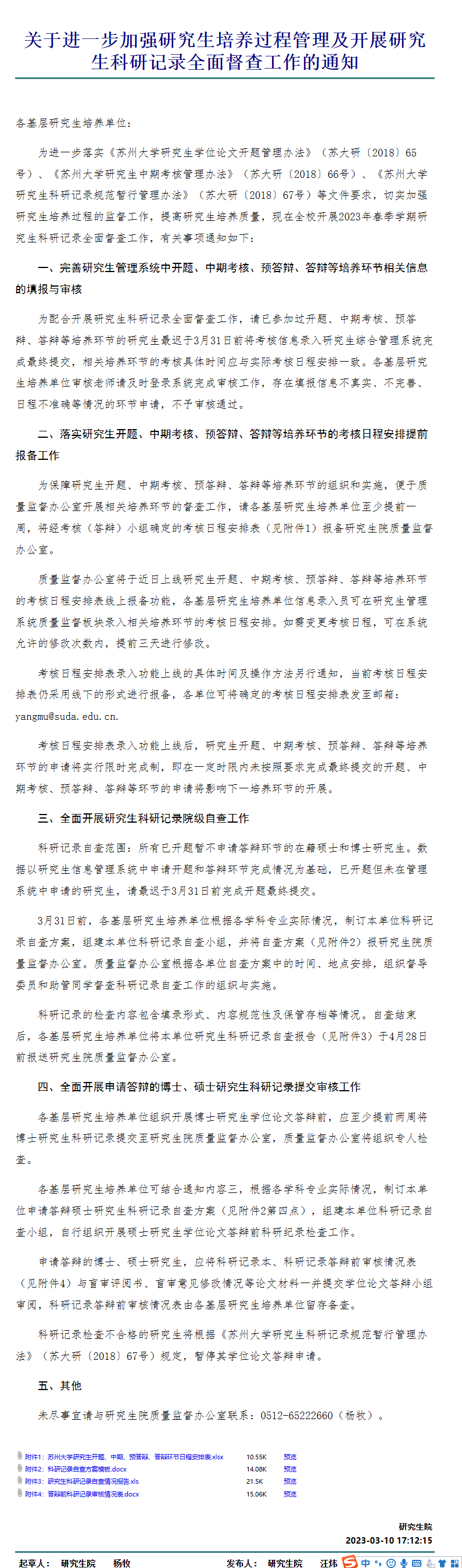 各位导师、各位同学:学校在2023年3月10日发布《关于进一步加强研究生培养过程管理及开展研究生科研记录全面督查工作的通知》//file.dmxstop.com/defaultroot/gov/info_view_my.jsp?whir_new_verifyCode=1&editId=35534455,