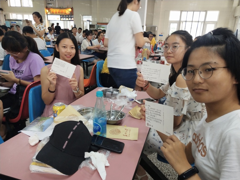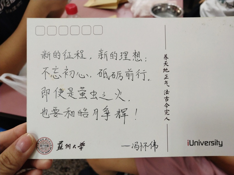 随后,分党校成员们给新生们送上了来自辅导员孙老师以及18级学长学姐们的明信片。学长学姐们或表以节日祝愿,或分享学习经验,或晓以人生哲理……同学们收到卡片后惊喜万分,又感触良多。孙老师也在明信片中寄予期望与祝福:“希望各位发奋学习,努力实现自己的人生价值,尽可能帮助善良的人,全力照顾好家人,争取为国家争荣誉!希望你可以找到属于自己的幸福,健康快乐地享受生活!”老师的话,是指引,也是鼓励,激荡着同学们的心。同学们手执明信片两角,暗自许下未来四年的誓言。