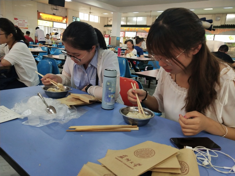 活动最后,在食堂工作人员的帮助下,饺子全都煮好端上。同学们纷纷拿起碗筷,配上蘸料,满足而快意地品尝自己的成果。