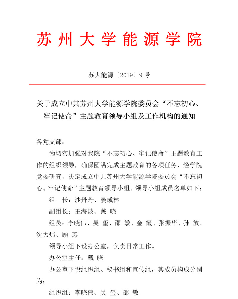 关于成立中共耽美小说 委员会“不忘初心、牢记使命”主题教育领导小组及工作机构的通知 苏大能源〔2019〕9号