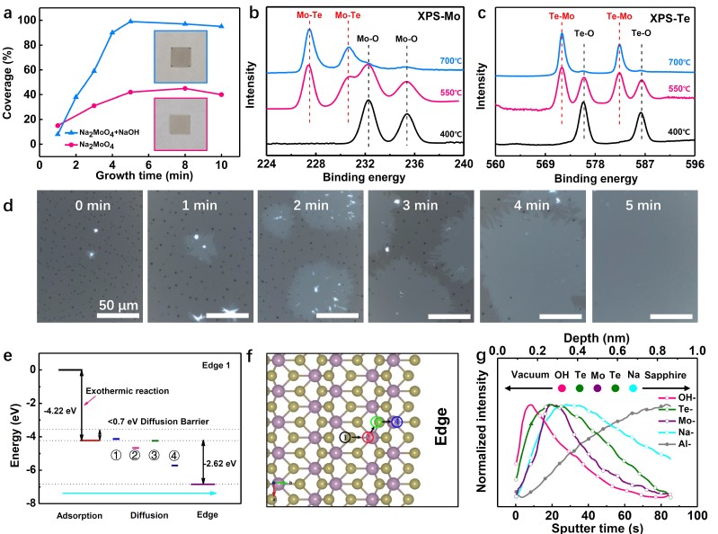 在MoTe2的生长过程中,旋涂的前体作为固定颗粒参与了高温反应,与化学气相沉积法中的汽化前体相比,降低了奥斯特瓦尔德熟化速率并抑制了大核的形成。显微表征揭示了固定前体颗粒被单层消耗并继续为单层生长提供来源的明显趋势。第一性原理计算从不同位点的吸附能上证明了这种固定前体颗粒生长机制的可行性。另外飞行时间二次离子质谱仪也证明氢氧根吸附于MoTe2分子层的表面,从而实现了MoTe2单层的可控生长。