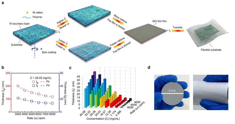 近日,耽美小说 邹贵付教授团队提出了一种聚合物辅助准原子沉积的策略,实现了从原子层面上精准控制高质量氧化镍(NiO)薄膜的大面积生长。通过调控镍前驱体浓度和旋涂速率,精准生长40 nm到亚纳米级(0.92 nm)任意厚的NiO薄膜,并成功将其转移到柔性基底上,生长的柔性NiO薄膜有着良好的透光性和柔韧性。