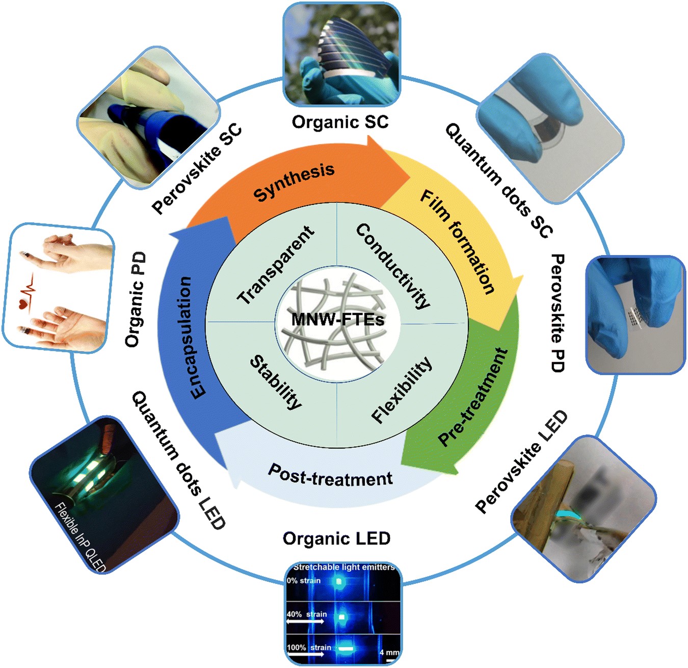 高质量的透明电极提供足够的透光率和导电性,是柔性光电器件不可或缺的部分。与商业氧化铟锡ITO相比,金属纳米线因其优异的光电特性、机械柔韧性、溶液处理性以及与半导体的更高兼容性而被认为是柔性透明电极的理想候选。基于金属纳米线柔性透明电极(MFTE)的柔性和可拉伸光电器件在效率和稳定性方面的性能迅速提高,在可穿戴电源、显示器和传感器方面具有广阔的应用前景。然而,与材料制备和器件制造相关的某些关键挑战仍然存在于MFTE的实际应用中。