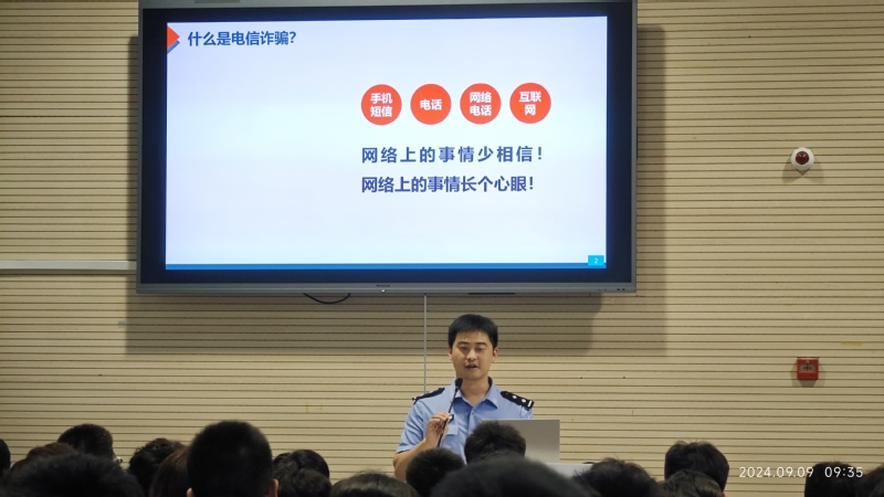 丁仁杰警官首先向新生们介绍了9种常见的电信网络诈骗类型,并用生动的案例帮助同学们深入了解当下电信网络诈骗的多样性和复杂性,教授同学们不同骗术的识别方法,努力提高同学的防骗意识,积极营造美丽安全的网络环境。