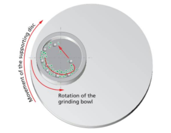 行星式球磨机也叫高能球磨机,是机械合金化和机械活化中最重要的一款仪器。对其工作原理,我们可以通过下图的展示进行一个详细的描述:行星式球磨机都有一个主盘,也叫太阳盘,在主盘上有一个、两个或四个安放研磨碗的底座。当主盘转动时,研磨碗绕主盘轴公转的同时又围绕自身轴心自转,做行星式运动,且其自转方向与转盘转动方向相反。在行星式运动中,研磨碗和主盘旋转所形成的离心力作用在研磨碗内的研磨球和物料上,由于研磨碗和主盘旋转方向相反,所以,离心力在同向与反向间交替发挥作用,结果就是研磨球摩擦研磨碗一侧的内壁(摩擦力粉碎物料),当到达一定强度时,强力撞击另一侧内壁(撞击力粉碎物料),撞击力通过研磨球之间的相互碰撞使其作用增大。物料就是在此强力的冲击力和碾压下,得以粉碎、研磨、分散或混合。