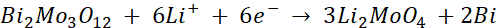 结合材料的CV测试分析(图2a),对BMO负极材料进行原位同步辐射XRD表征,如图2b-c所示,BMO初次嵌锂经历不可逆的转换反应,生成Li2MoO4和金属Bi(公式1),对应于首圈CV曲线中的2.07 V还原峰(图2a)。在后续的电化学储锂过程中,如公式2所示,Li2MoO4通过形成Li2+xMoO4进行锂离子的可逆嵌脱反应,贡献储锂容量,对应于CV曲线中1.16/1.62 V的氧化还原峰对。另一方面,在低电压下,Bi转变为Li3Bi合金,进行合金化和去合金化可逆储锂(公式3),对应于CV循环上约0.6/1.0 V的氧化还原峰对。BMO负极材料电化学嵌锂机理,如图2d和如下反应式1-3所示。