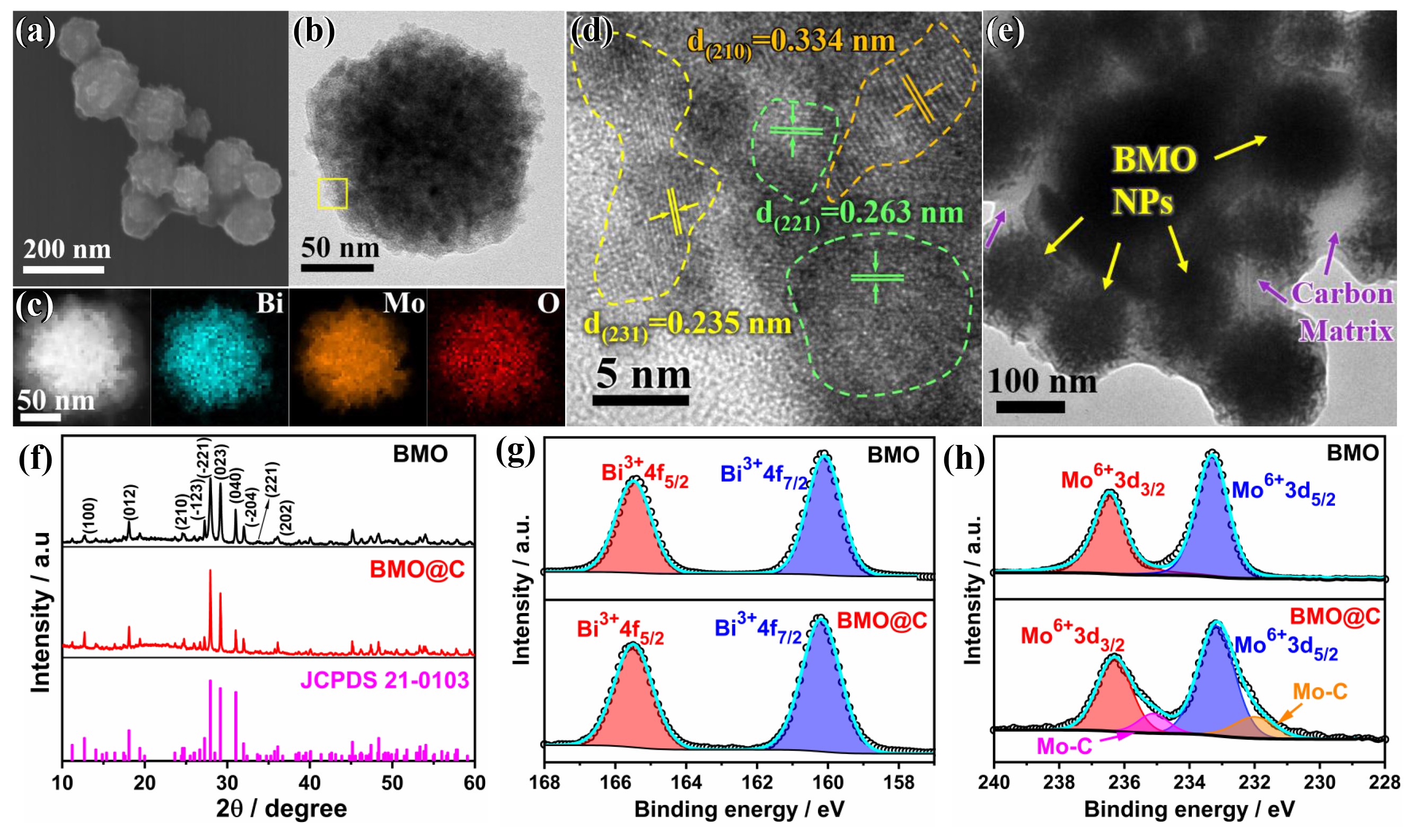 图1. BMO的(a)SEM图,(b)TEM图,(c)STEM模式元素Mapping图,(d)HRTEM图;(e)BMO@C的TEM图;BMO和BMO@C的(f)XRD图谱,(g)Bi 4f和(h)Mo 3d的高分辨XPS图谱。