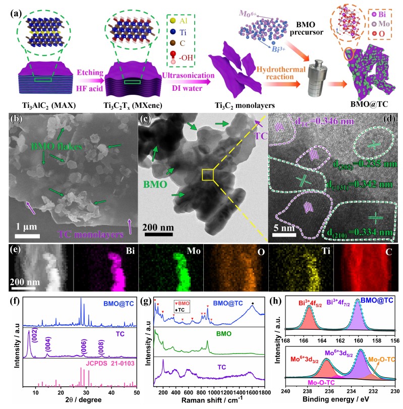 图3.BMO@TC复合材料的(a)制备过程示意图,(b)FESEM图,(c)TEM图,(d)HRTEM图,以及(e)STEM模式下EDS元素Mapping图。(f)BMO@TC2和TC的XRD图谱,(g)BMO、BMO@TC和TC的Raman光谱,以及(h)BMO@TC材质的Bi 4f和Mo 3d的XPS高分辨图谱。