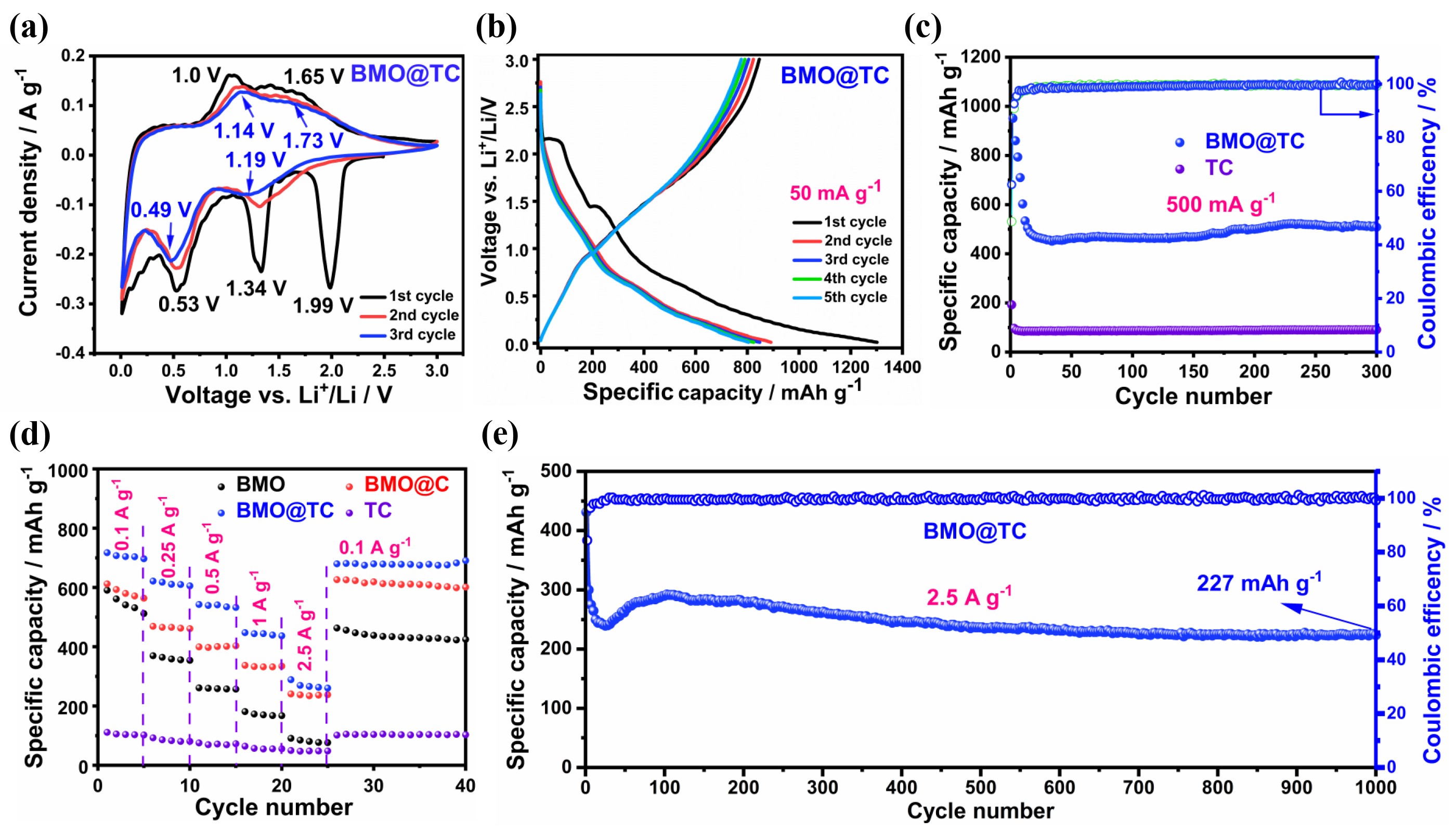 图4.BMO@TC复合材料的电化学性能:(a)在0.1 mV s-1的扫速下的前三圈CV曲线,(b)在50 mA g-1电流密度下的前五圈循环充放电曲线,(c)在500 mA g-1下的循环容量保持曲线,(d)不同电流密度下的倍率性能以及(e)2.5 A g-1的1000圈循环容量保持曲线。