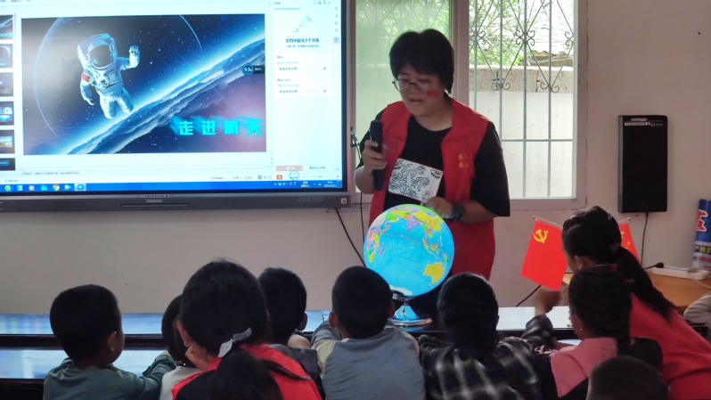 在科普活动室里,志愿者夏欣瑶通过图文并茂的PPT和视频,为小朋友们讲解了航天知识,激发了他们的好奇心,在他们心中种下了崇尚科学、探索航天的种子。
