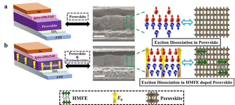 器件结构和激子分离示意图a)对照组和b)HMFE掺杂的钙钛矿器件结构、SEM截面和激子分离示意图。在HMFE自发极化电场作用下,HMFE掺杂的钙钛矿薄膜显示的电荷分离。Ep:HMFE的自发极化电场。(标尺500 nm)