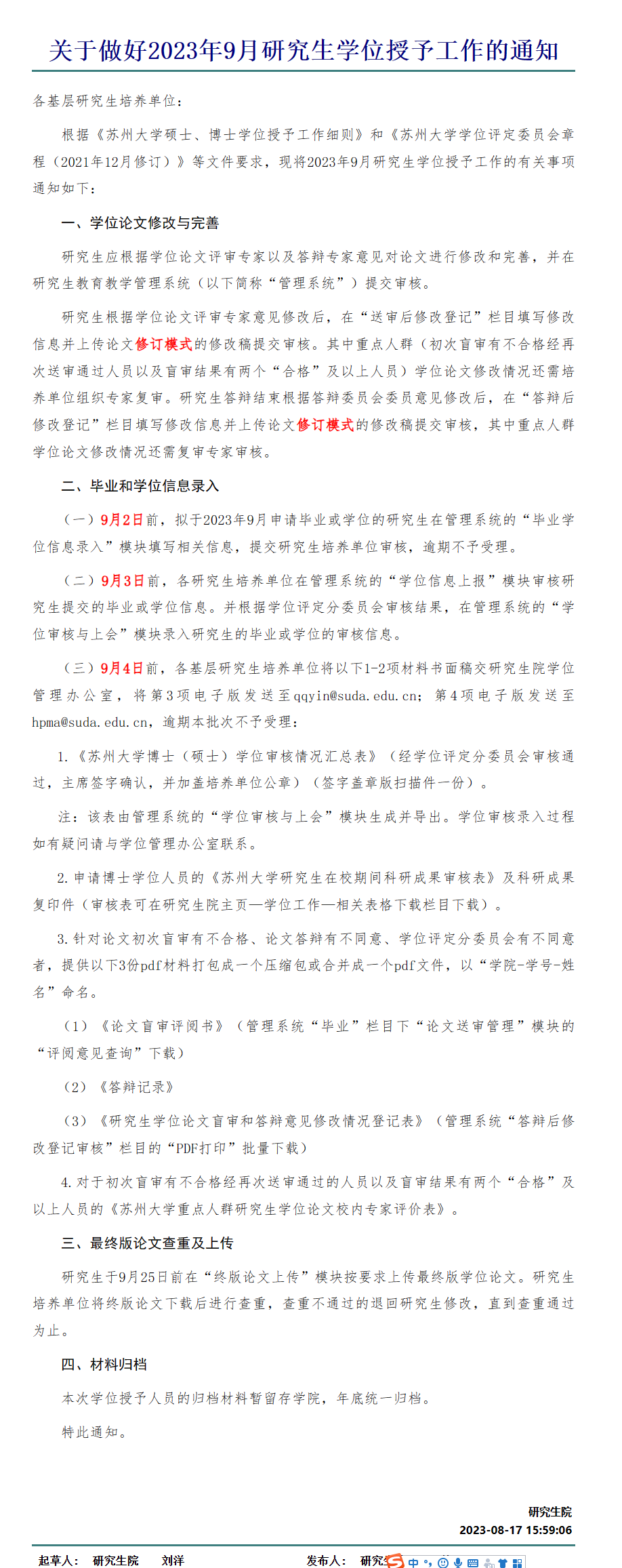 一、根据学校通知《关于做好2023年9月研究生学位授予工作的通知》//file.dmxstop.com/defaultroot/gov/info_view_my.jsp?whir_new_verifyCode=1&editId=36128285,请以下同学根据通知做好通知中要求的工作。