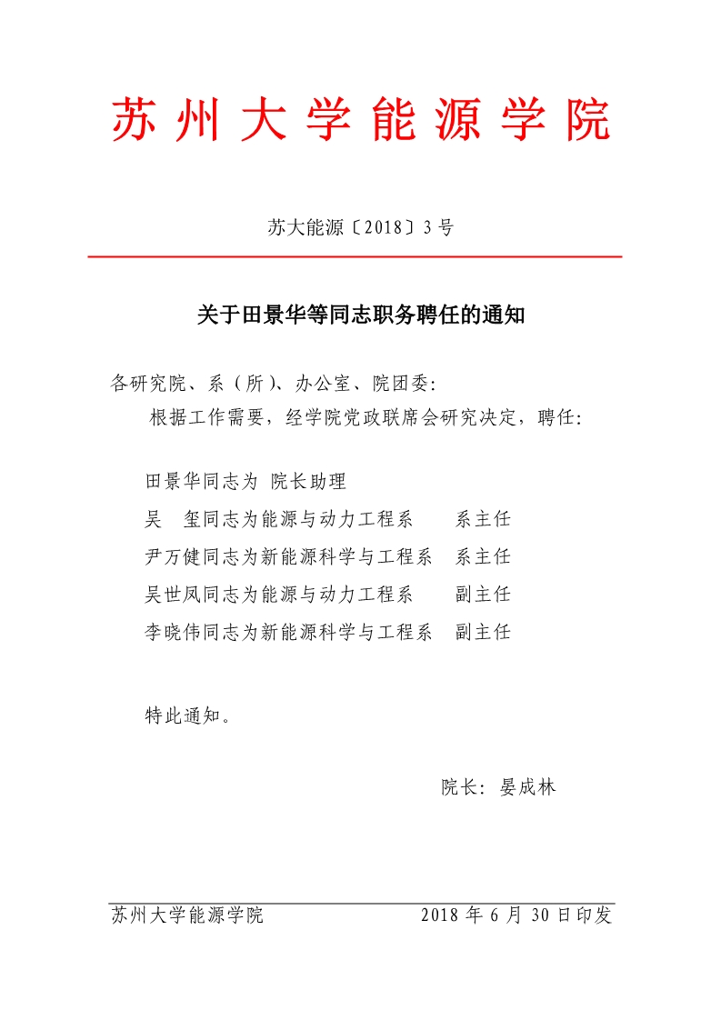 关于田景华等同志职务聘任的通知 苏大能源〔2018〕3号