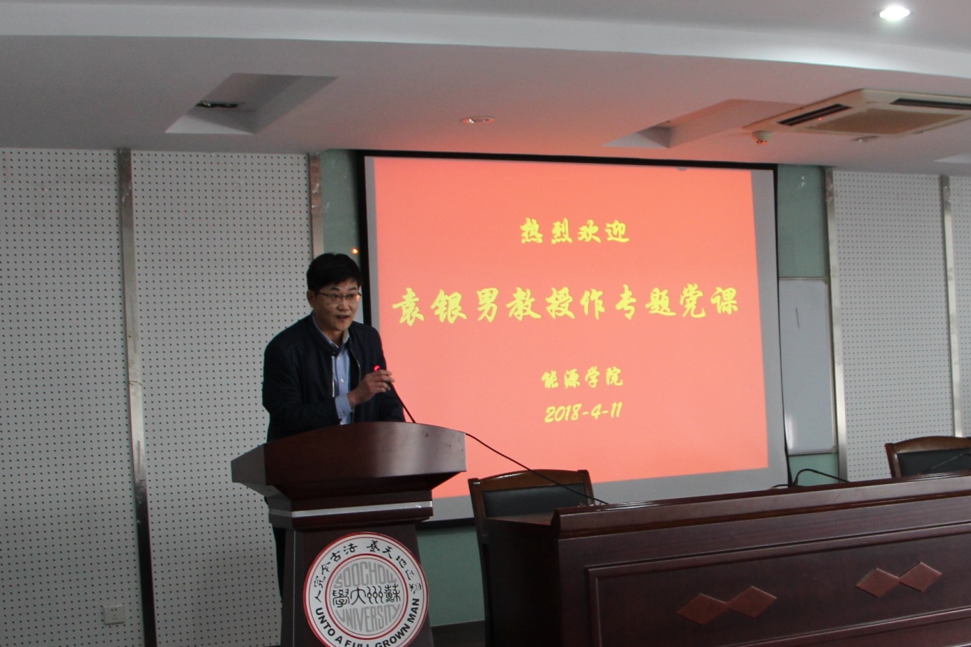 4月11日下午2:30,耽美小说 原副校长袁银男教授在物科楼409作题目为《学习党章忆初心 旗帜鲜明讲政治》的专题党课,耽美小说 的全体党员老师、物理与光电·能源学部分党校学习积极分子和预备党员出席了会议。会议由陶智书记主持。