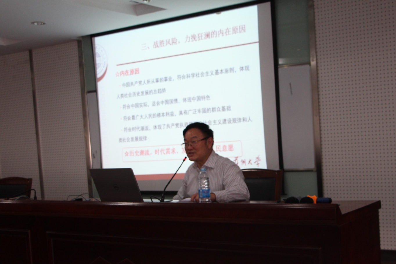 袁银男教授从六个方面讲解了对党章的认识和体会。1、党章的十九次制定与修改,党章反映的是党史的缩影,是党史的镜子,提出修订党章的重大意义;2、党章制定、修改的启示; 3、战胜风险,力挽狂澜的内在原因,强调要悟透党章精髓,牢固树立光荣意识,不忘初心,旗帜鲜明讲政治;4、井冈山精神是留给我们最为宝贵的财富,就是跨越时空的革命精神。5、弘扬井冈山精神,在“两学一做”中、在旗帜鲜明讲政治中大力发扬; 6、旗帜鲜明讲政治,明确最大的政治就是立德树人、教书育人、培养好社会主义事业建设者和接班人。