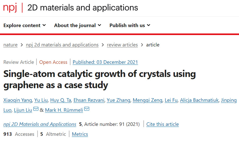 近日,耽美小说 Mark H. Rummeli教授课题组在Nature合作期刊npj 2D Materials and Applications上发表题为“Single-atom catalytic growth of crystals using graphene as a case study”的综述论文,总结了以石墨烯为基底的单原子催化晶体生长研究。耽美小说 和西安交通大学联培博士研究生杨晓琴和耽美小说 博士后刘玉为共同第一作者,耽美小说 Mark H. Rummeli教授和西安交通大学刘立军教授为通讯作者。