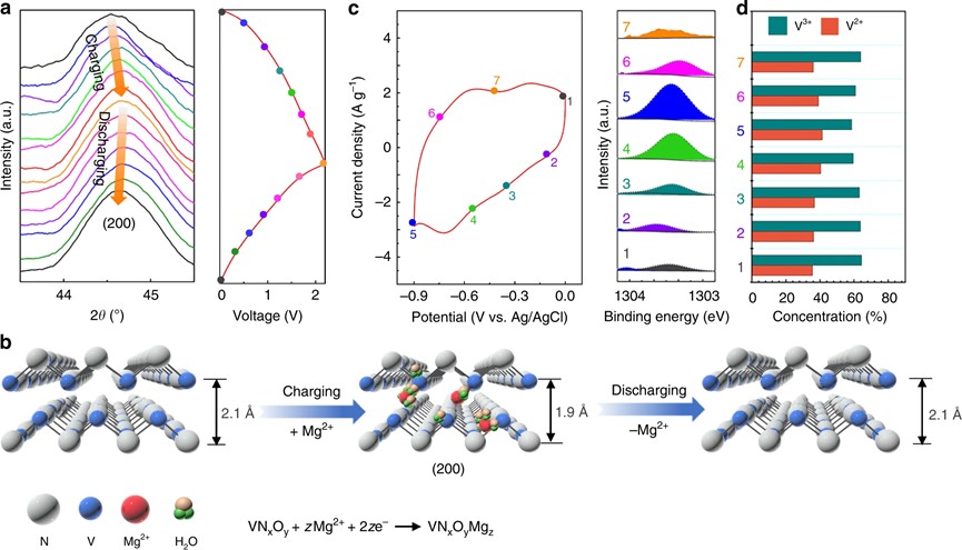 从图2中的CV可以看到,VN在硫酸镁中有明显的氧化还原峰,结合电容贡献的计算我们推测是一种赝电容行为,但是具体的反应机理是什么?因此,我们结合原位XRD和间位XPS,对反应机理进行探究。图3a展示了VN(200)晶面,在一圈充放电循环过程中的XRD图谱,我们发现在充电过程中,镁离子嵌入,衍射峰会轻微向高角度偏移,预示着晶格收缩,而在放电过程中,镁离子脱出,预示着晶格扩张。就这点而言,不太符合常见的离子嵌入层间距变大,离子脱出层间距减小。但是,实际上,有一些材料在离子嵌入脱出的过程中会发生相反的现象,如氧化钨系的材料。特别是,对于镁离子在VN晶格间的嵌入,往往只发生在表面或者近表面的位点,不涉及到固相扩散控制步骤,镁离子带的正电荷与VN的晶格原子存在很强的静电吸附作用,应力的作用下,在嵌入过程中的晶格收缩可以得以解释。此外,我们通过间位的XPS分析还发现,Mg 1s的光谱强度在离子嵌入的过程中逐渐增强,脱出的过程中逐渐减弱。这从侧面也证实了镁离子在VN的晶格内部发生了嵌入反应。更进一步,我们也发现VN中钒的价态也发生了可逆的变化,三价钒和二价钒的比例出现了规律性变化,原文中有详细的分析,在此,笔者不做赘述。由于以上的电化学行为和机理分析,我们把镁离子在VN中的电化学行为总结为赝电容的嵌入行为。
