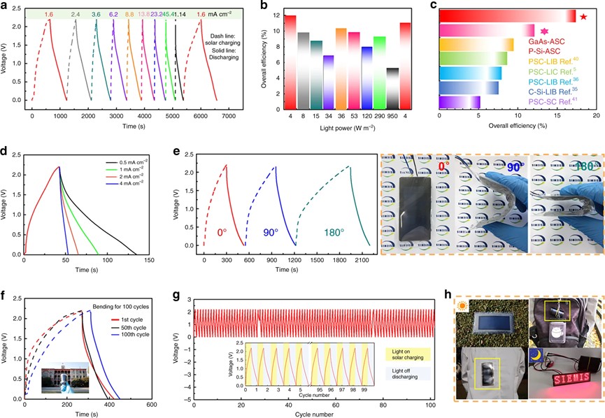 最后,我们利用打印的微型超级电容器构筑了柔性太阳能直充的自供电单元。图6a展示了在不同光强下充电和同一电流放电的数据,可以看出,组装的超级电容器作为储能部分展示出强健的电流调节能力,从1.6到114 mA cm−2,自供电单元仍然能够正常工作。我们也对不同光强下的整体能量转化效率进行了计算,发现当与多晶硅太阳能电池集成时,弱光条件下的转化效率最高达到11.95%(4 W m−2的太阳光入射光强)。而当与砷化镓太阳能电池集成时,1000 W m−2的太阳光入射光强下,整体能量转换效率达到突出的17.57%。我们把原因归于超级电容器高的能量存储效率以及太阳能电池本征高的光电转化效率。当与柔性的非晶硅太阳能电池进行集成时,表现出5.2%的整体转化效率,也是高于其他报道的工作。更重要的是,构筑的柔性自供电单元展现出很好的弯折性能(图6e,f)和突出的循环稳定性,100圈光充电放循环后,容量保持为98.7%(图6g)。