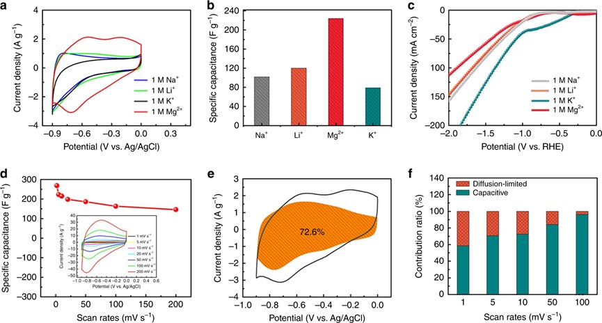 负极VN在镁离子电解液中的电化学行为首先通过三电极的体系来研究。我们保持电解液中阳离子浓度一样,分别对比了在硫酸镁,硫酸锂,硫酸钠和硫酸钾中的CV。可以看出,在镁离子体系中具有最大的比电容,达到240 F g−1,显著高于其他电解液体系。主要的原因归于镁离子体系中两电子的法拉第转移过程,容量和电子转移数成正比(CV曲线和相应的比电容展示在图2a,b中)。此外,我们也发现,镁离子相对于其他单价的阳离子存在更高的析氢过电势,图2c中LSV极化曲线能够比较清晰的反应这一点。图2e和2f展示了VN在镁离子电解液中的电容贡献图。相对来说,VN在镁离子中表现出来的还是较为明显的电容行为,这一点从图2d中不同扫速下的CV中也能看出来,从1 mV s−1到200 mV s−1,氧化还原峰之间的间隙并没有很明显的增大,这也预示着较为优异的倍率性能。