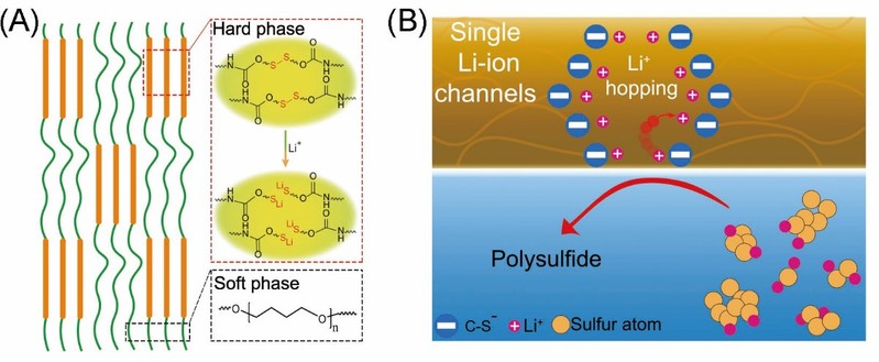 晏成林教授课题组成功设计并合成了一种具有单锂离子通道的高性能聚合物粘合剂。这种粘合剂可以在快速传输锂离子的同时抑制多硫化物穿梭,因而适用于Li–S电池。