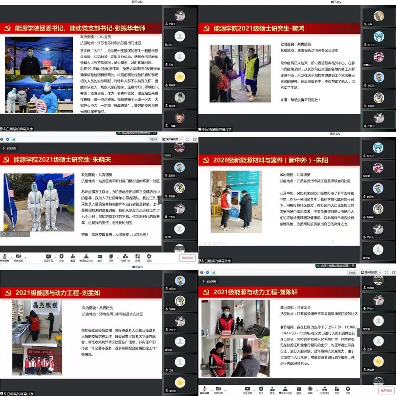 团委书记、本科生能动党支部书记张振华老师分享了首次当“大白”的经历,他指出,疫情当前,青年党员要有“舍小家为大家”的大局意识,要有不畏艰险、冲锋在前的责任感和使命感,用实际行动书写自己的抗疫故事。春运期间,2021级硕士研究生樊鸿加入了长沙火车站的志愿者队伍,核验健康码,协助核酸检查,宣传防疫规定,他感慨道:志愿服务中的一声声“谢谢”,融化了初春的寒冷也温暖着我,志愿服务不仅帮助了他人,也充实了自我。苏州疫情爆发后,2021级硕士研究生朱晓天申请加入了姑苏区的青年志愿者队伍,身着防护服和防护面罩,从早晨六点起连续工作近七小时,身体力行践行着新时代新青年的责任与担当。2020级新能源材料与器件(新中外)的朱阳积极投身社区防疫,在社区内人口流量较大的农贸市场内做志愿者,核对进入市场内人们的核酸检测证明及健康码,为苏州防疫工作贡献青春力量。为协助做好待返乡人员和已经返乡人员的疫情防控工作,2021级能源与动力工程的刘孟如两次加入志愿者队伍,统计住户信息,宣传防疫要求,用爱心和耐心让社区群众感受到真情和温暖。春节期间,2021级能源与动力工程的刘陈轩主动放弃休息时间,加入了志愿者队伍。社区老年人口众多,他负责人脸识别和身份验证,疏导服务老年人等特殊群体,共进行志愿服务10天,将志愿者精神内化为担当的自觉,外化为实际的行动。