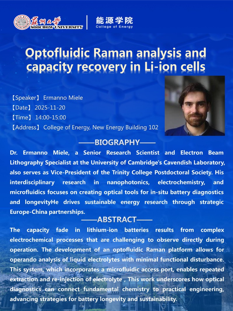 学术报告:Optofluidic Raman analysis and capacity recovery in Li-ion cells