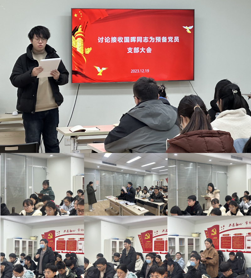 随后,组织委员廖如兰同志代表支部委员会报告对国晖同志的政审情况,并传达上级党委的预审意见。与会党员姜勋源、方可和刘婷婷发表意见,对国晖同志的入党动机和现实表现进行充分讨论,大会采取无记名投票的方式进行表决,作出决议,同意接收国晖同志为预备党员。