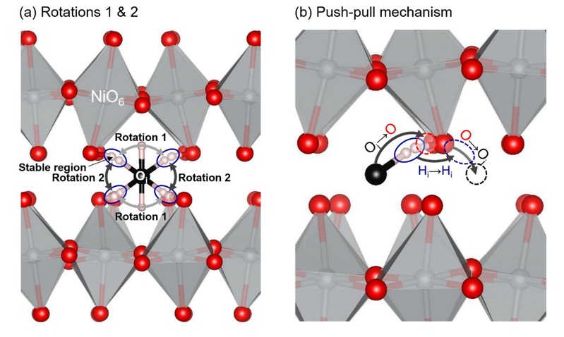 近日,耽美小说 韩东麟教授团队与京都大学Toyoura Kazuaki副教授、挪威奥斯陆大学Truls Norby教授合作,结合实验表征、理论计算、缺陷化学的理论分析,系统研究了Ruddlesden-Popper(RP)型阴极材料La2NiO4+δ和La2-xAxNiO4+δ(A = Ca, Sr, Ba)中的质子导电特性。结果表明,在250~300°C的温度区间内,质子电导率随着温度和Sr掺杂浓度增加而提高,相同掺杂浓度下,掺Ba样品的质子电导率显著高于Sr掺杂的样品(图1)。理论结算的结果揭示,上述材料中的质子以氢氧根离子形式通过push-pull机制进行迁移(图2)。因此,在RP型氧电极材料中,质子的实质载流子为氢氧根离子(OH-),表明La2NiO4+δ是空穴、氧离子和氢氧根离子的混合导体,将应用于PCFC的氧电极时,将呈现一种不同于已知模式的新型的阴极反应机制,这为进一步探索和优化RP型氧化物的混合导电机制,研发高性能的PCFC氧电极材料提供了全新的指导思路。