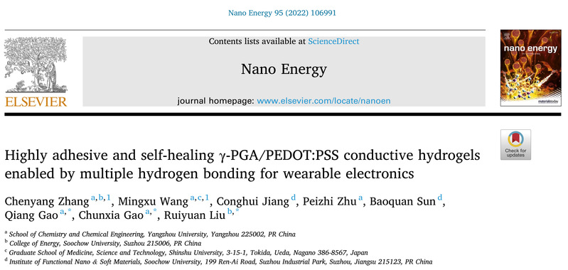 本工作将具有优异导电性能的PEDOT:PSS引入生物基γ-PGA水凝胶系统中成功制备了一种兼具高粘附性、自修复、导电性能和生物相容性的γ-PGA/PEDOT:PSS水凝胶,并用于人体活动监测。以复合水凝胶为基材设计了一种接触响应式的摩擦纳米发电机,在人机交互领域表现出潜在的适用性。该研究成果以 “Highly adhesive and self-healing γ-PGA/PEDOT:PSS conductive hydrogels enabled by multiple hydrogen bonding for wearable electronics”为题发表在《Nano Energy》上。论文的共同第一作者为耽美小说 科研助理张晨阳以及日本信州大学博士研究生王明序,通讯作者为扬州大学高强副教授、高春霞副研究员和耽美小说 刘瑞远教授。