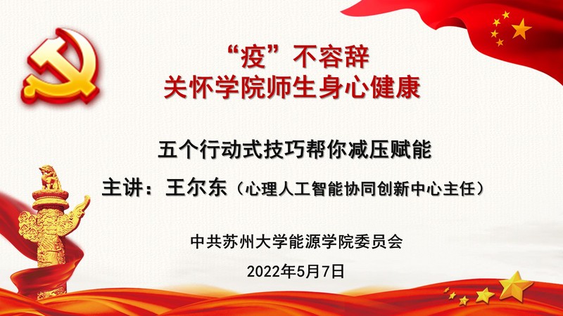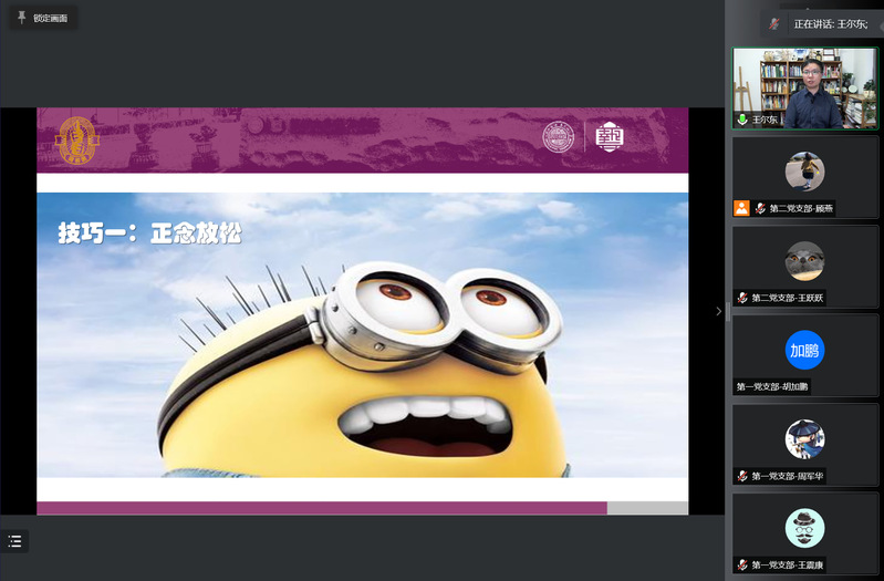 为帮助学院师生缓解心理压力,调整积极状态, 2022年5月7日,耽美小说 教职工党支部、研究生党支部和本科生党支部在线联合举办“‘疫’不容辞 关怀学院师生身心健康”开放式主题党日活动,特邀耽美小说 心理人工智能协同创新中心主任王尔东主讲题为《五个行动式技巧帮你减压赋能》的专题讲座。会议由学院党委书记沙丹丹主持。