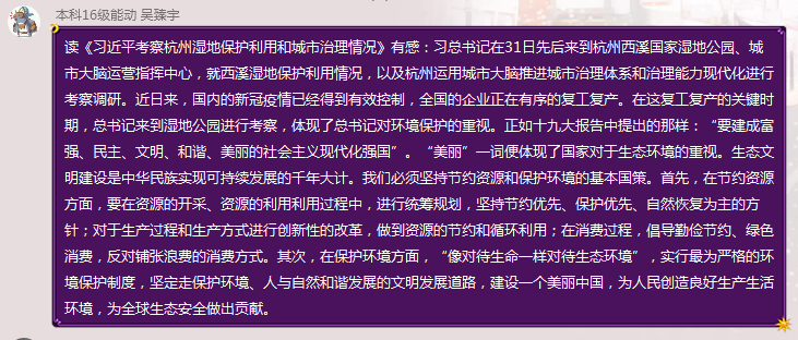 从《习近平出席二十国集团领导人应对新冠肺炎特别峰会并发表重要讲话》中,学员们明白了疫情当前,正是中国各方勠力同心、齐心协力、团结应对,始终将人民生命安全和身体健康放在首位,并凝聚起战胜疫情的强大合力,才有了如今持续向好的态势;在《习近平:统筹推进疫情防控和经济社会发展工作,奋力实现今年经济社会发展目标任务》中,学员们看到了中国政府做出的伟大的决策和部署、提出的完善的重大疫情防控体制机制、建立的完备的公共医疗卫生体系,准确把握了国内外疫情防控和阶段性经济形势变化,切实地保障了人民的生命安全;在《习近平考察杭州湿地保护利用和城市治理情况》中,学员们意识到了中国要建设的现代化是人与自然和谐共生的现代化,只有树立和践行“绿水青山就是金山银山”的理念,坚定地走文明发展的道路,贯彻落实可持续发展理念,才能实现建设美丽中国的美好愿望;而在《全球战“疫”,习近平这样阐释人类命运共同体》中,学员们深刻理解了“人类命运共同体”这一概念的内涵,在世界多元化、经济全球化的国际大背景下,只有树立起人类命运共同体意识、顺应人类社会互联互通潮流、汇聚起全世界的智慧与力量,才能共建美好的地球家园……