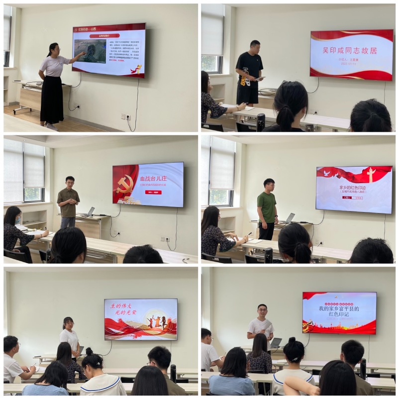 在“家乡的红色印记”分享环节,六位党员同志依次讲述了他们家乡的红色印记。2020级博士生苏艳慧分享了抗战时期的新四军英雄血洒疆场时穿的一双草鞋、闪耀国际主义光芒的一台打字机等老物件,讲述了老一辈革命者和三晋儿女用鲜血和生命铸就的气贯长虹的太行精神和吕梁精神;2021级博士生王震康介绍了来自沭阳县的一位摄影师——吴印咸同志,展示了抗日战争时期拍摄的众多珍贵的影视资料;2020级硕士生赵国祥同志带领大家重温了台儿庄战役取得的重大胜利,领会了前辈们不畏牺牲、誓死保国的大无畏精神;2020级硕士生彭明吉介绍了新四军血战八滩、全歼日军山本中队的八滩战役,和平生活来之不易,向那些用血肉之躯捍卫祖国的抗战老兵们致敬;2021级硕士生李嘉婷讲述了革命战士刘胡兰英勇赴义的故事,以及她坚定信念、不屈不挠、敢于担当、勇于奉献的精神;2021级硕士生杨帆分享了家乡富平县发生的康庄战役,彻底粉碎了国民党军队增援中原的企图,为中原地区解放事业打下了坚实基础。