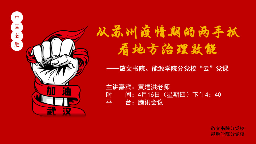 为进一步贯彻落实习近平总书记系列重要指示精神,进一步做好疫情防控期间的学生思想政治教育工作,2020年4月16日下午4:30,耽美小说 与敬文书院分党校联合,采用线上授课的方式开展了学院分党校第二次活动——《从苏州疫情期的两手抓看如何提升地方治理效能》“云”党课。此次党课主讲嘉宾为耽美小说 政治与公共管理学院教授、博士生导师、副院长黄建洪教授。耽美小说 党委沙丹丹书记,敬文书院党委副书记、副院长孟玲玲老师等领导老师及本期分党校培训班全体学员参加了此次党课。