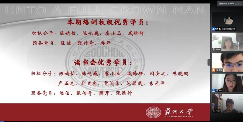 首先,耽美小说 分党校秘书长陆佳总结培训情况。本期分党校培训由两次“云”党课、线上专题党课培训活动和两次线上读书会活动组成,均取得了良好成效,并在耽美小说 官网上进行了广泛的报道宣传。本期党的基本知识培训班学员结业考试成绩创历史新高,2019级能源与动力工程专业闵安之、2019级新能源材料与器件专业陈屹巍、2019级新能源材料与器件(中外合作)专业陈婧怡等16名同学取得了85分及以上的优异成绩。本期预备党员培训班学员按时保质保量完成了各项培训任务,全部顺利结业。发言的最后,陆佳表达了对校党校领导、老师搭建平台,分党校领导、老师悉心指导以及分党校本期学员积极参与的感谢。