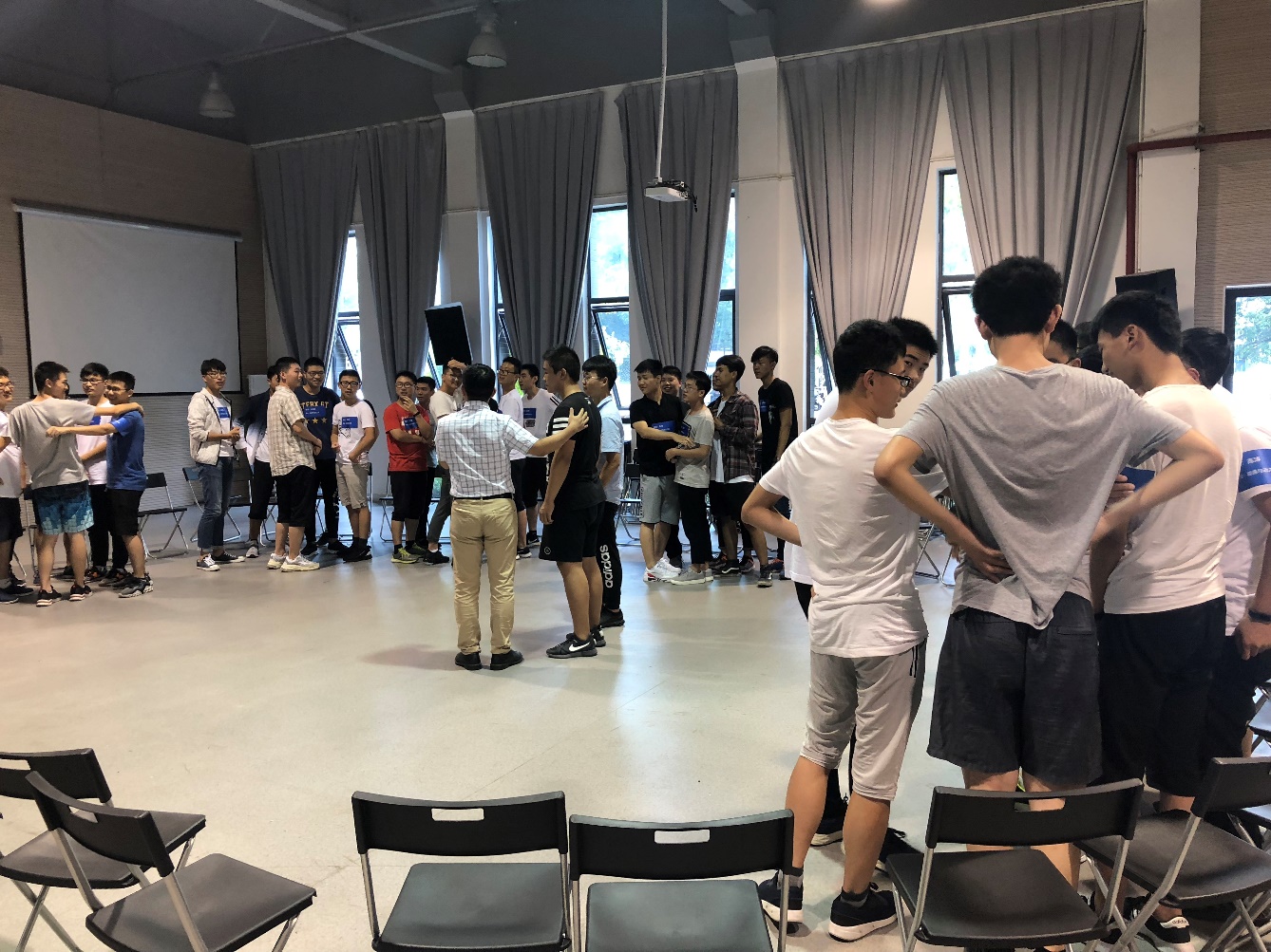 熟识同学们放下拘谨,很快融入到紧张而激烈的游戏中去,逐渐拉近了距离。在简单的热身之后,同学们的积极性也都被调动起来。紧接着的便是第二个游—“无家可归”。要求同学们在听到指令后迅速按照人数要求抱在一起,旨在让同学们体验集体的归属感,凝聚班级力量。