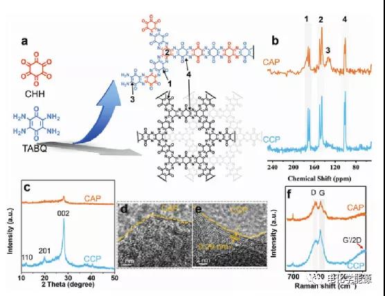 图2. a)CAP和CCP的化学结构图,b)它们的固态13C核磁共振谱,c)PXRD图案,d,e)高分辨率TEM图像,以及f)拉曼光谱。