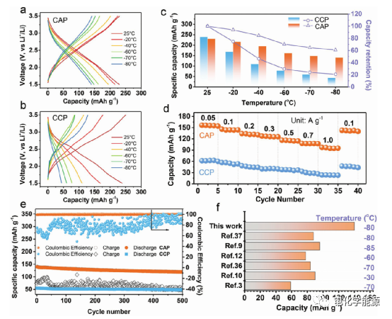 图4. a,b)CAP(a)或CCP(b)在+25到-80 °C之间的速率进行充/放电。d) 速率性能和e) 超低温下-60 °C的循环性能的比较。