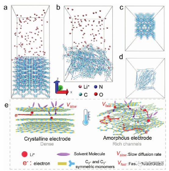 图1. a,b) 锂离子在213K时在晶态电极(a)和非晶态电极(b)中扩散的MD模拟。电解质溶液是0.75M的DOL中的LiTFSI。c,d) 显示晶态电极(c)和非晶态电极(d)结构的MD模拟。e) 晶态电极和非晶态电极低温性能差异的原因示意图。