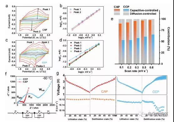 图3. a,c)不同扫描速率下的CV曲线,以及b,d)相应的b值计算。e)不同的扫描速率下,电容容量和扩散限制容量的贡献率。f)CAP(红色)和CCP(蓝色)的典型奈奎斯特图。g) GITT曲线和在-60℃下锂化/脱锂状态下计算出的Li+表观扩散系数。